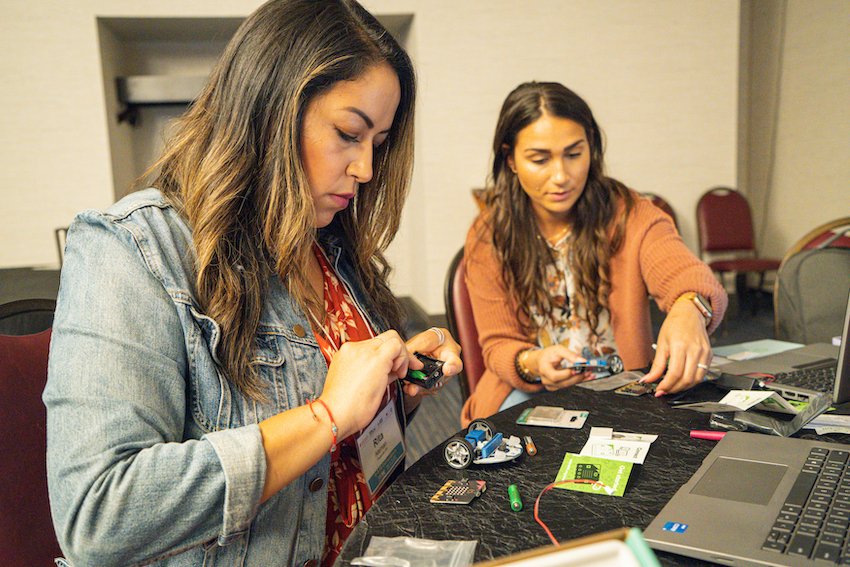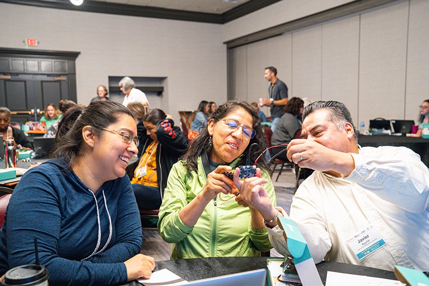 Building a CS FutureNetworking, educational opportunities abound at inaugural K-5 PD extravaganzabyWesley Bomar Aug. 23, 2023 Feature Story Migrated from TACC Teachers Lisa Ortiz (left), Ma Elvia Soto Juarez (center), and Javier Aguilar (right) study a micro:bit robot during the K-5 Professional Development Extravaganza. Here’s a universally agreed-upon fact: teachers need all the support and resources they can get.This summer, TACC’s Expanding Pathways in Computing (EPIC) team held its inaugural K-5 Professional Development (PD) Extravaganza, a gathering of educators and professional development providers that offered a unique opportunity for teachers to connect. Teachers from across Texas learned new strategies and techniques and deepened their knowledge of computer science (CS) in the K-5 classroom.Sessions at the Extravaganza aligned to the new Technology Applications Texas Essential Knowledge and Skills (TEKS) standards required to be implemented by the start of the 2024-2025 school year.“There aren’t many professional development opportunities in CS and computational thinking for K-5 educators, and with the new TEKS on the horizon, we wanted to show teachers how to integrate these standards into core curricula,” said Judy Lau, EPIC’s CS professional development coordinator and a former teacher. “I’m excited for teachers to learn these vital CS skills and pass them on to the workers of the future.”Forty-five participants attended the Extravaganza. Attendees responded positively to the hands-on, interactive nature of the conference and the introduction of the new TEKS lesson plans.Due to the positive feedback, the WeTeach_CS team is discussing ways to scale up this event in the future. One idea is to host regional collaboratives, where select educators are equipped to train teachers across multiple districts throughout the state. Judy Lau is the professional development coordinator for the EPIC team. Lau is also a former teacher. Pflugerville ISD Technology Integration Specialists Rita Aleman and Hoda Mohamed expressed their gratitude for lessons learned at the Extravaganza.“Hoda and I want to start a Girls Who Code club in our ISD and give young girls a chance to learn about things like coding,” Aleman said. “This conference provided an opportunity to learn ways that other educators are incorporating CS concepts in their classrooms.Added Mohamed: “I’m excited to take the Tech Apps TEKS lessons from the Extravaganza and show Pflugerville teachers how they can integrate these lessons in their classrooms.” “The greatest challenge to providing CS learning opportunities to Texas students is not equipment or broadband but rather a shortage of teachers who have had an opportunity to learn CS themselves." Sean Justice of Texas State University’s College of Fine Arts led a session on teaching Scratch Jr. to students.“As teachers, we feel like we have to know everything about everything, but we don’t,” Justice said. “A teacher admitting this in a classroom setting lets students know that it’s OK for them to ask for help.”EPIC Partnership Coordinator Sheryl Roehl led sessions on computational thinking, cybersecurity, and physical computing. Roehl’s goal was to spark a curiosity in teachers that could be passed on to their students.“I wanted teachers to receive training and resources designed to inspire STEM curiosity in their students,” said Roehl, a former teacher with Victoria ISD. “Teachers are the catalysts to expand students’ perspectives and, in many cases, their career choices.” Pflugerville ISD Technology Integration Specialists Rita Aleman (left) and Hoda Mohamed (right) check out STEM resources. Aleman and Mohamed wish to start a "Girls Who Code" and give young girls a chance to learn STEM skills like coding.” With new K-5 standards set for implementation in the 2024-2025 school year, the WeTeach_CS team saw the K-5 Extravaganza as a perfect opportunity to offer professional development for Texas teachers in integrated computational thinking.“The greatest challenge to providing CS learning opportunities to Texas students is not equipment or broadband but rather a shortage of teachers who have had an opportunity to learn CS themselves,” said EPIC Director Carol Fletcher, also a former teacher. “There’s no substitute for a dedicated and well-prepared teacher to keep kids engaged and on track.”Explore the state of CS education at your school and in your district with the WeTeach_CS Texas CS Education Data Dashboard. The dashboard offers an interactive look at CS enrollment rates, access equity, and more.